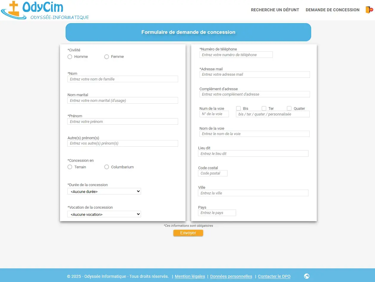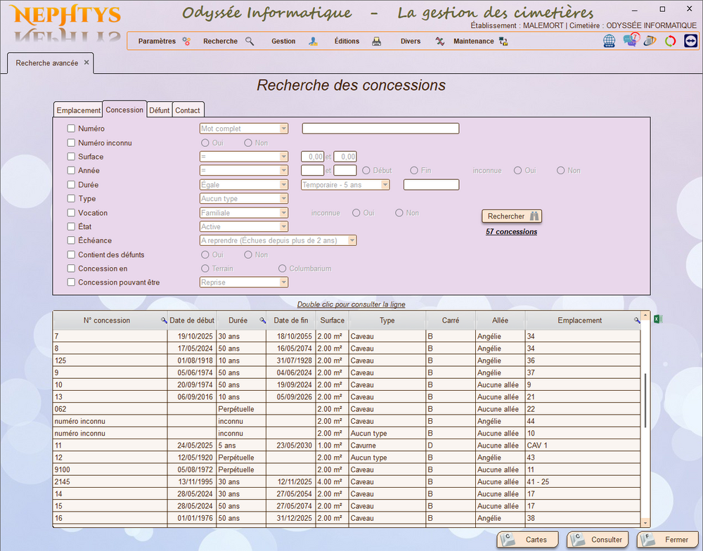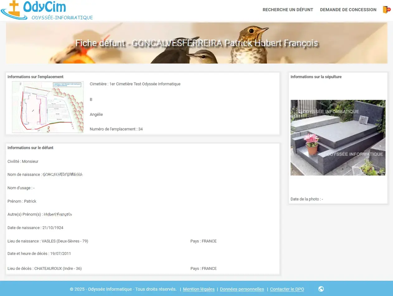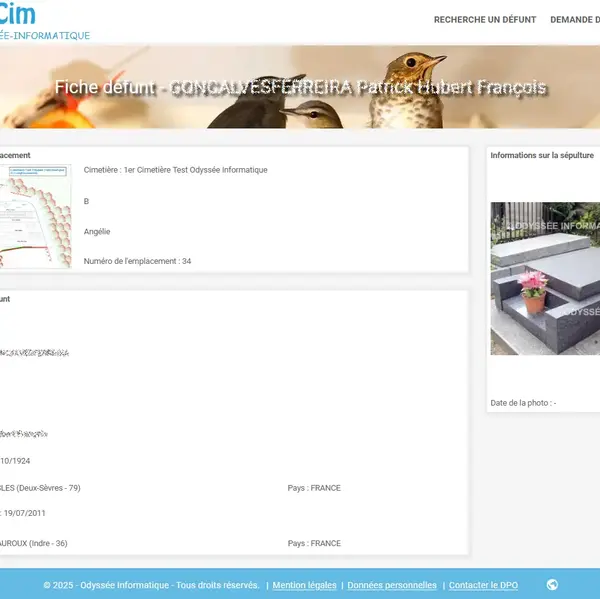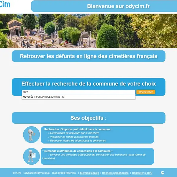 - Gestion des cimetières, carrés, allées, emplacements, concessions, contacts, défunts, travaux, prestataires, tarifs, et agendas.