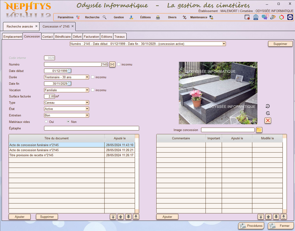 - Éditions (décisions, arrêtés, registres, courriers, avenants, titre provisoire de recette, demande de concession ou de renouvellement, etc...)